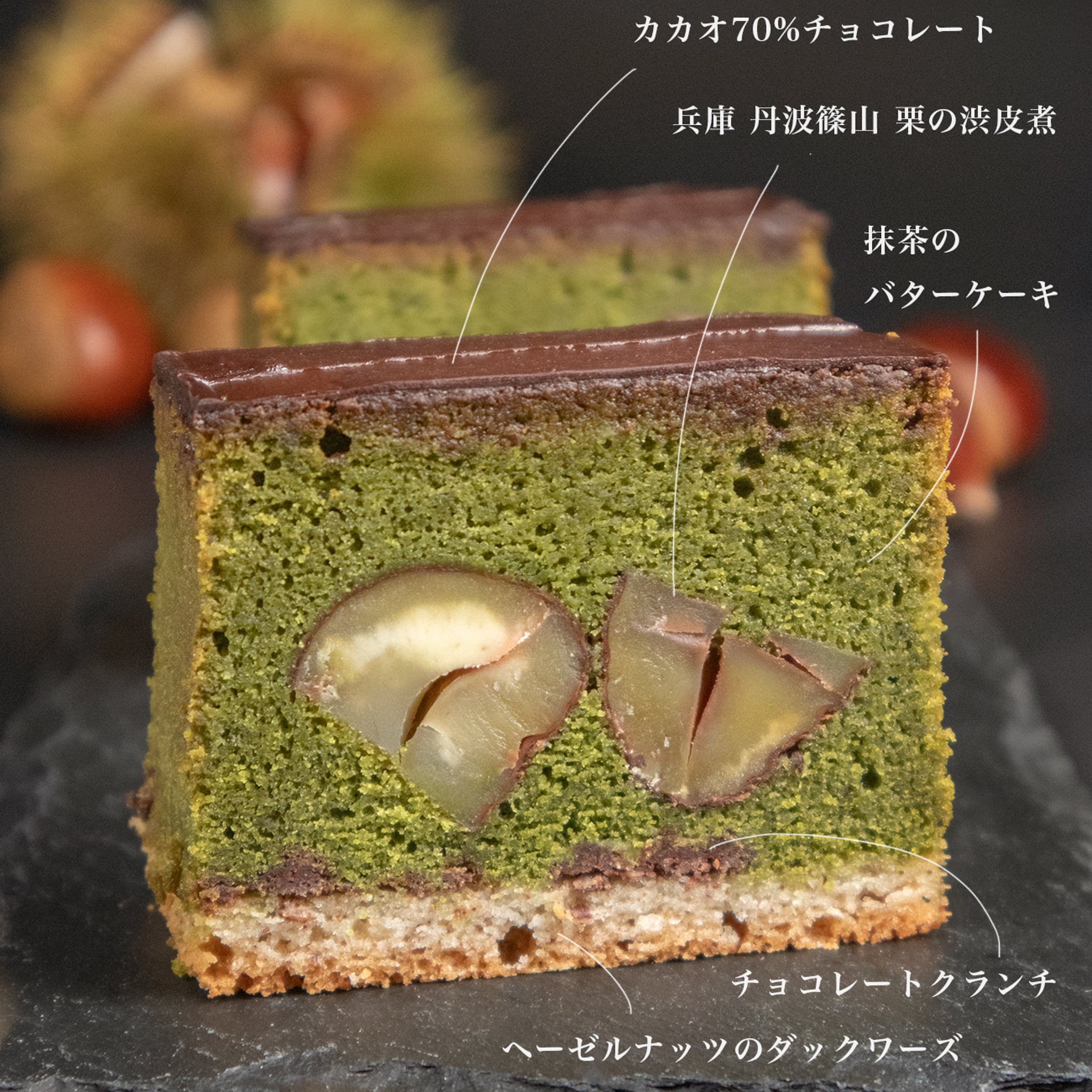 京都・宇治の緑茶を使用したケイクに、兵庫・丹波篠山の栗を混ぜ込んだ秋季限定バターケーキ。