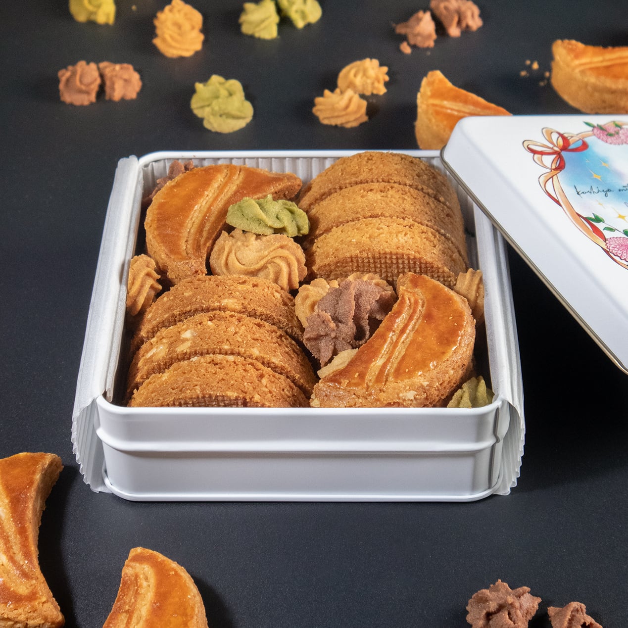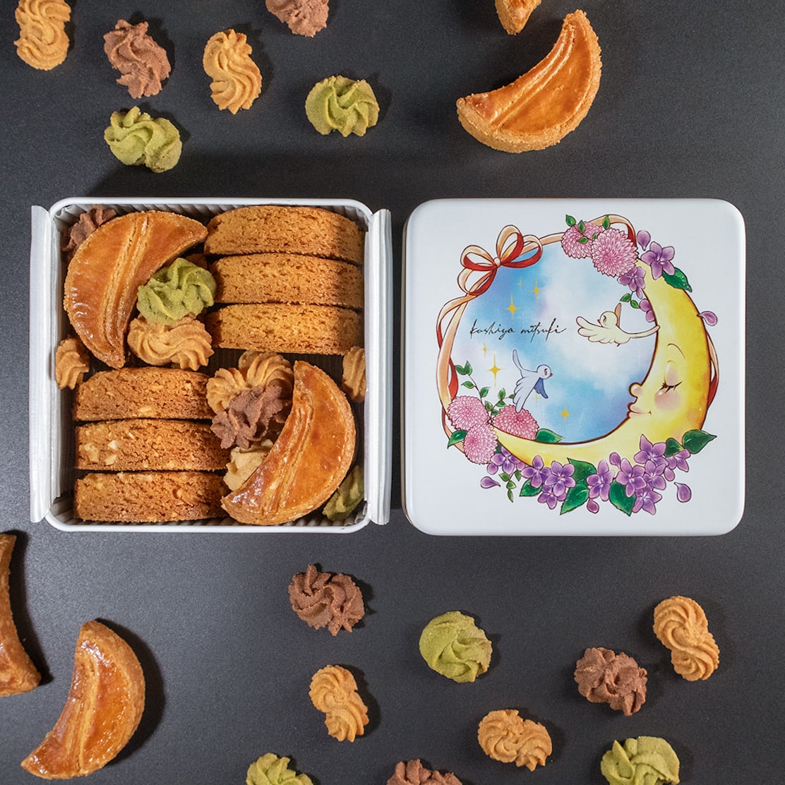 2種類のバターリッチな三日月クッキーと三日月にかかる雲を描いた「サブレ ヌアージュ」を密に閉じ込めたクッキー缶。